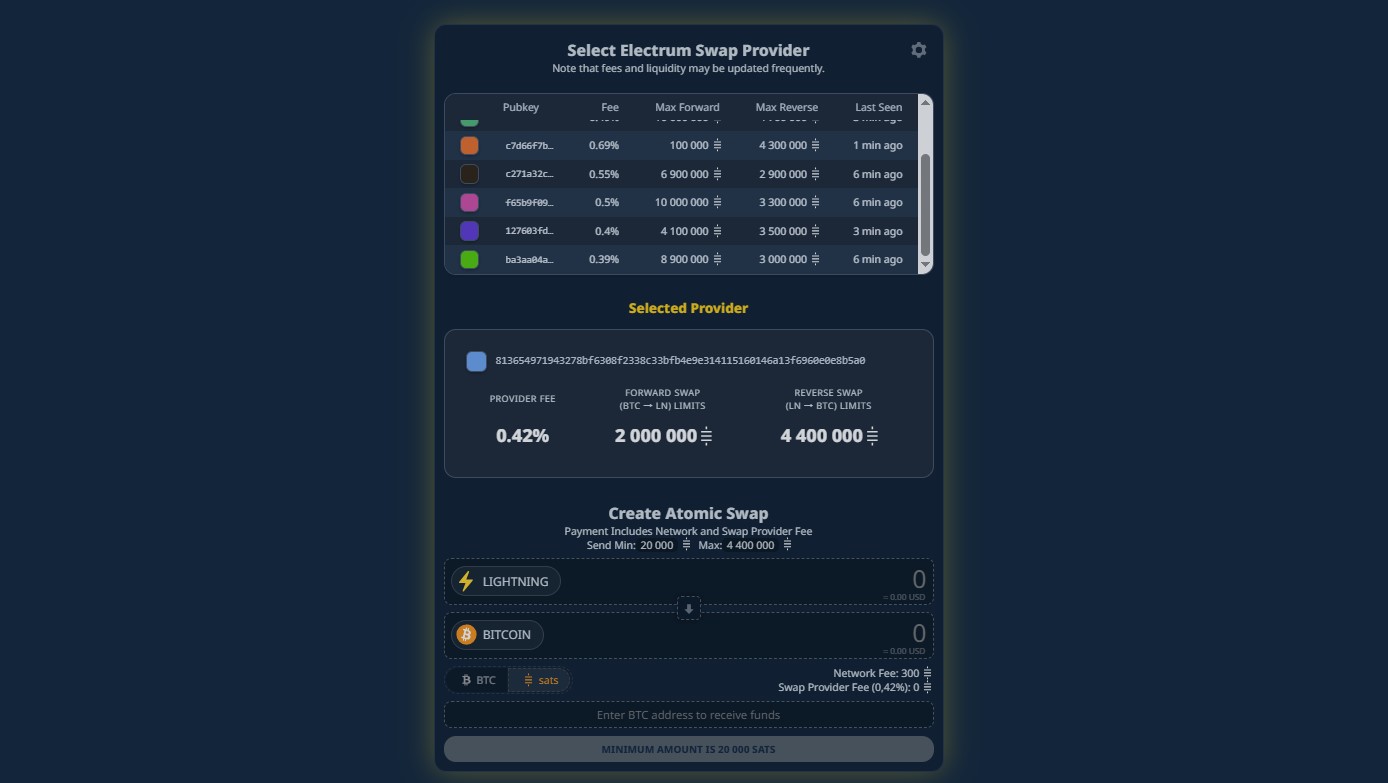 Al visitar su sitio web, se observa una interfaz minimalista diseñada exclusivamente para facilitar intercambios. El servicio aprovecha la infraestructura de Boltz, un protocolo de intercambios atómicos, y utiliza la implementación de Electrum para gestionar los contratos inteligentes que aseguran que las transacciones sean seguras y sin custodia.
