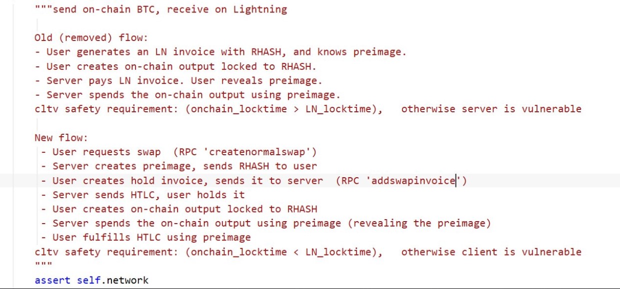 Al revisar el código de Electrum para el intercambio directo, vemos esto, lo cual nos parece desafortunado. Con el flujo anterior, podíamos implementar fácilmente la compatibilidad con intercambios directos, pero no sabemos cómo hacerlo con el nuevo flujo, ya que no tenemos control sobre la billetera LN del usuario. ¿Alguna idea o posibilidad de volver a habilitar la compatibilidad con el flujo anterior en los servidores?