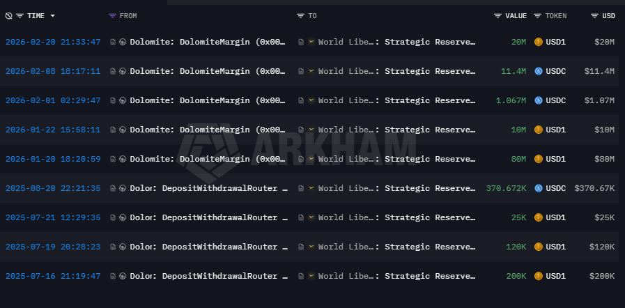 La secuencia que encendió las alarmas comenzó el 8 de febrero de 2026. Según datos expuestos por el explorador Arkham, ese día, la tesorería de World Liberty Financial depositó 14 millones de USD1, su propia stablecoin, en el protocolo de finanzas descentralizadas (DeFi) Dolomite como garantía y tomó prestados 11,4 millones de USDC. Minutos después, esos fondos fueron enviados a una dirección de Coinbase Prime, una plataforma usada habitualmente para conversión a dinero fíat u operaciones institucionales.