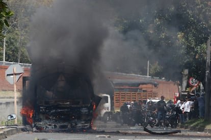 Un atentado fallido contra instalaciones militares ha sembrado de nuevo zozobra en Cali. Dos cilindros de gas acondicionados con explosivos fueron lanzados al interior del batallón Pichincha, donde opera la Tercera Brigada del Ejército de Colombia, en el sur de la ciudad, aunque no detonaron. En las inmediaciones, la explosión de un autobús hizo eco en toda la zona y desató un incendio. La acción frustrada, de la que aún no se conocen los responsables. El Ejército ha informado de que ya tiene el control del área y atiende la situación.